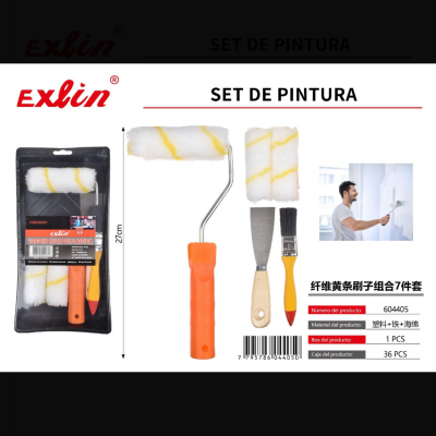 纤维黄条刷子组合托盘7件套 set de pintura, brochas de fibra con franjas amarillas, 7 piezas, bandeja