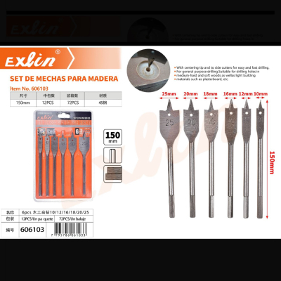 6pcs 木工扁钻10/12/16/18/20/25 set de mecha planas paramadera,6 piezas,10 mm/12 mm/16 mm/18 mm/20 mm/25mm