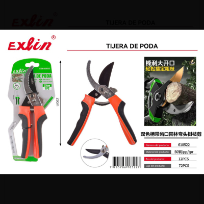 23cm双色(绿黑)柄带齿口园林弯头树枝剪 tijera de poda, 23cm, mango bicolor verde y negro, cabeza curva con dient...