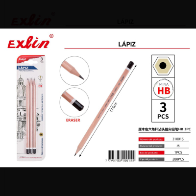原木色六角杆沾头削尖铅笔 HB 3PC lapiz hexagonal color madera HB afilado x3